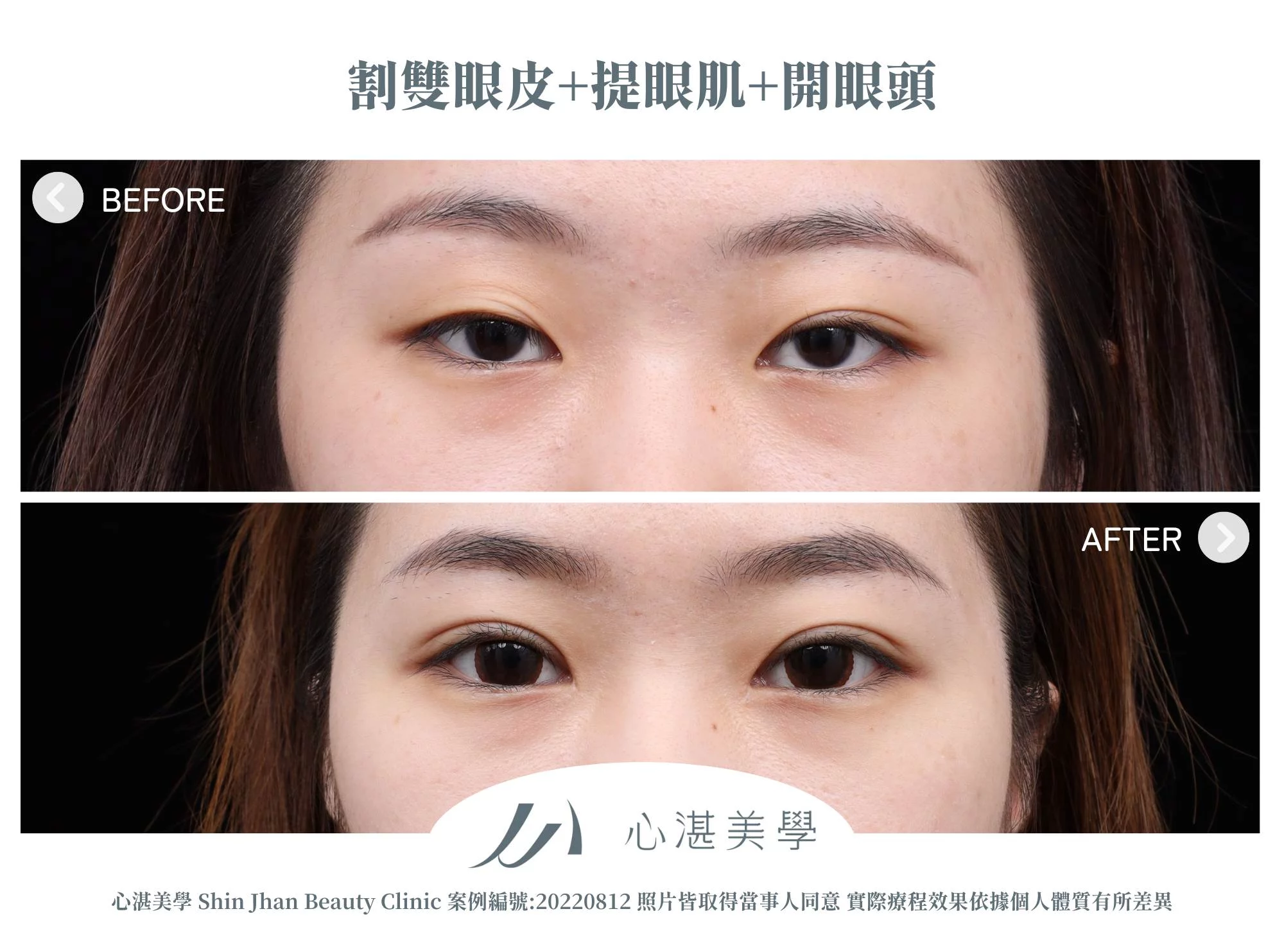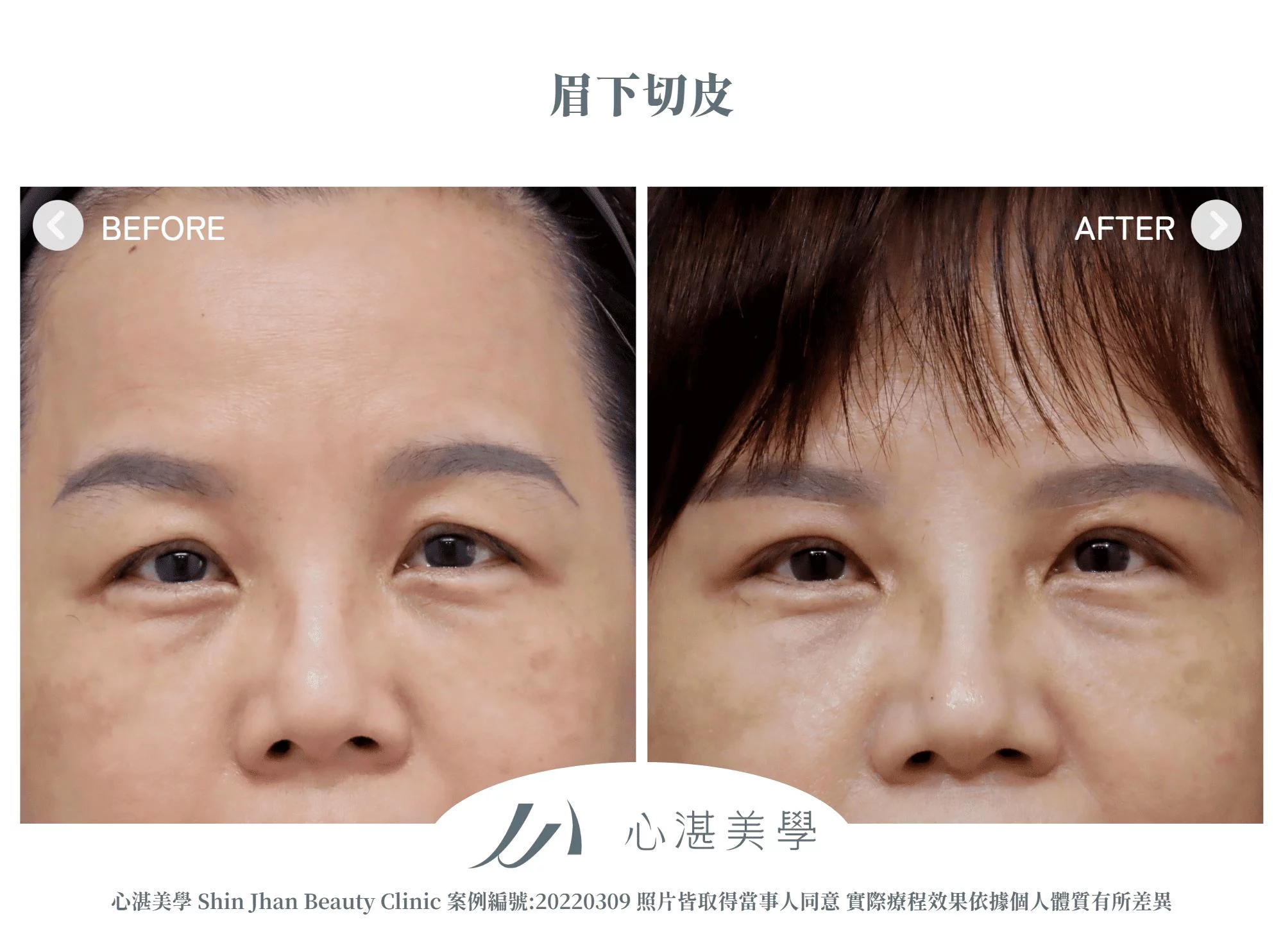 改善範圍 上眼皮鬆皮、眉眼距微調 整體上半臉、眉毛位置 睜眼力量與對稱性